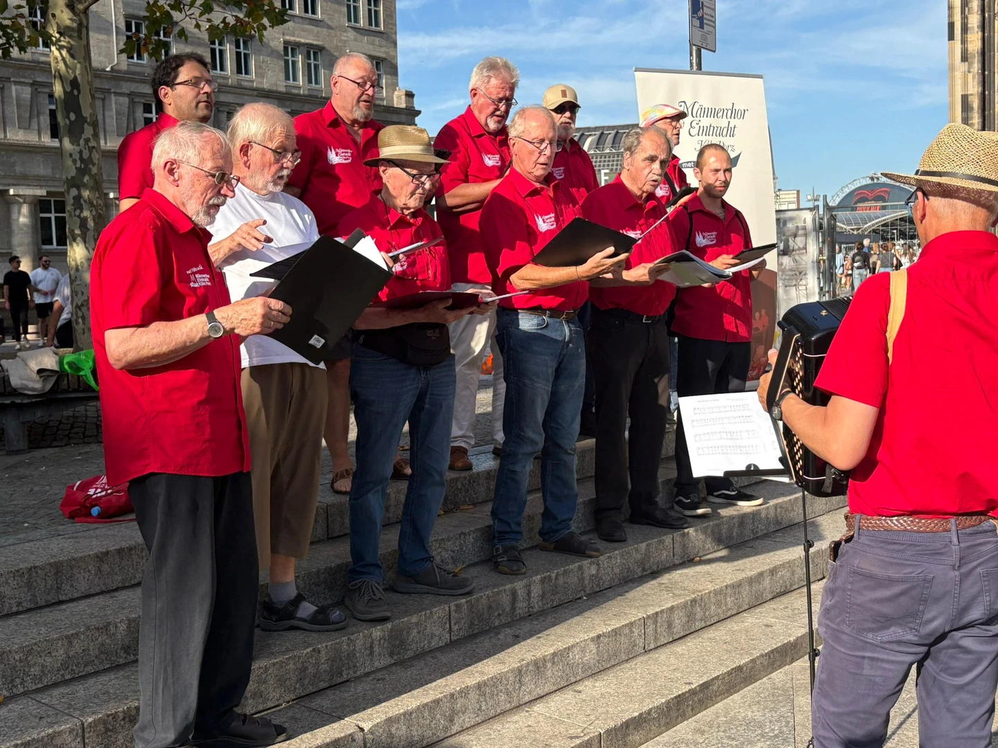 Ein klingendes Geschenk brachte der Männerchor Eintracht dem Kölner Dom zum 770. Geburtstag der Grundsteinlegung dieses großartigen Bauwerks. Auf der Domplatte, nahe der Kreuzblume, postierten sich die Sänger in ihren leuchtend roten Hemden und stimmten ein Potpourri rheinischer Lieder an – und die befassen sich zu einem sehr großen Teil ja auch mit dem Kölner Wahrzeichen.